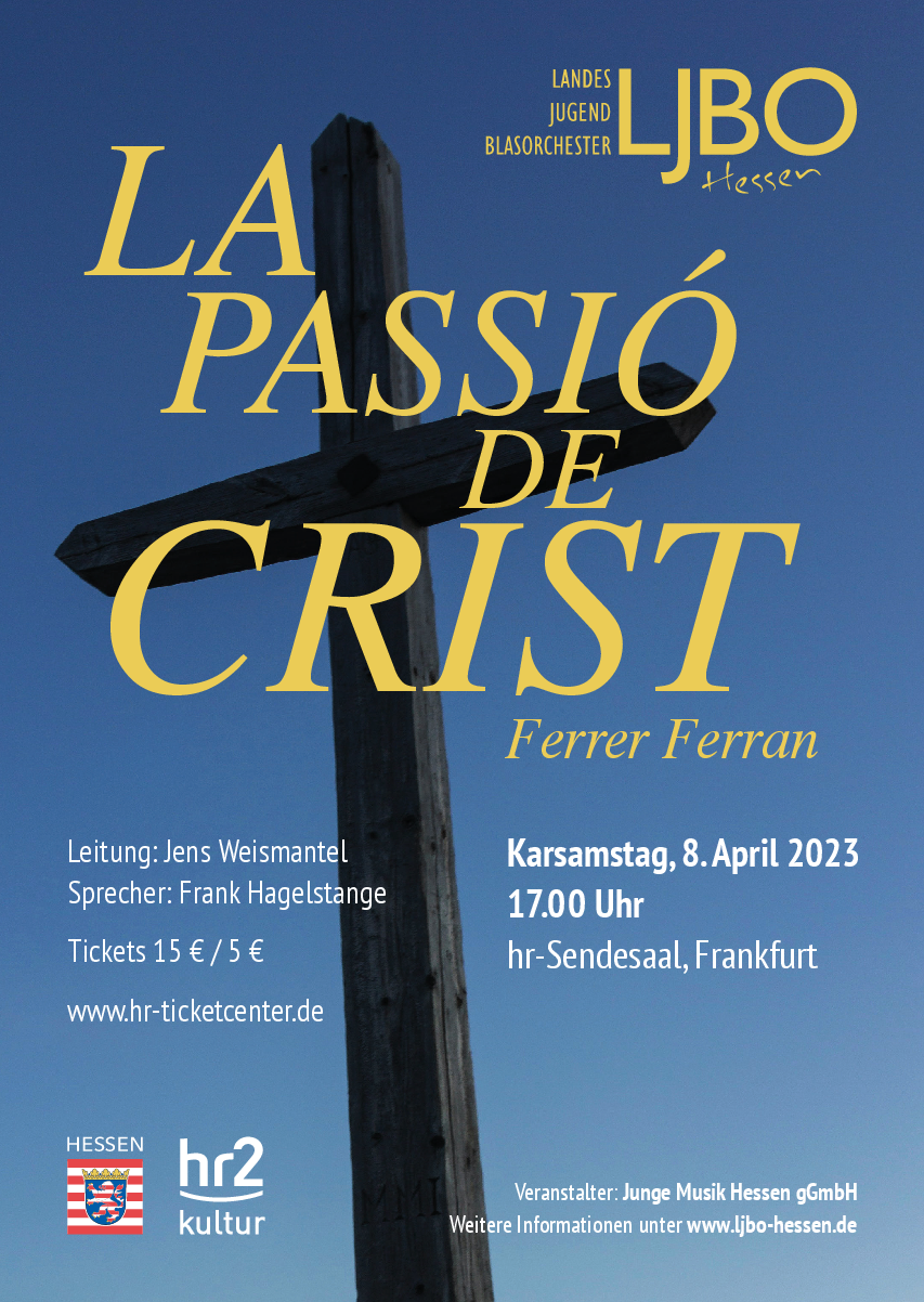 KonzertplakatProgrammAus tiefer NotMartin Luther, arr. Jacob de HaanLa Passió de Crist (Sprecher: Frank Hagelstange) I. Die Geburt – Die Ermordung der Unschuldigen – Die Taufe II. Die drei Versuchungen III. Ankunft im Tempel – Das Abendmahl – Verhaftung – KreuzigungFerrer FerranVexilla Regis HymnusAnton Bruckner, arr. Otto WimmerLa Passió de Crist HoffnungFerrer FerranHerbst 2014